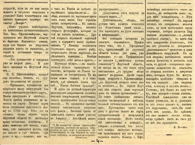 Из статьи г. В. П-ова мы узнаем, что первоисточником приведенных сведений о Якутской области является петербургская газета «Вечер», поторопившаяся оповестить мир, что ей «удалось побеседовать с известным путешественником Евг. Вас. Пфиценмайером». Нам что-то не приходилось встречать описания путешествий г. Пфиценмайера, и мы пока знали его только в роли скромного препаратора зоологического музея академии наук... Да, слишком поторопилась газета произвести в ранг известных путешественников и знатоков нашего севера и особенно Якутской области, человека, который, как и все петербуржцы, каждого якута принимает за японца... Не этою ли способностью смешения объясняется то обстоятельство, что г. Пфиценмайер нашел в Якутской области не якутов, а японцев?..