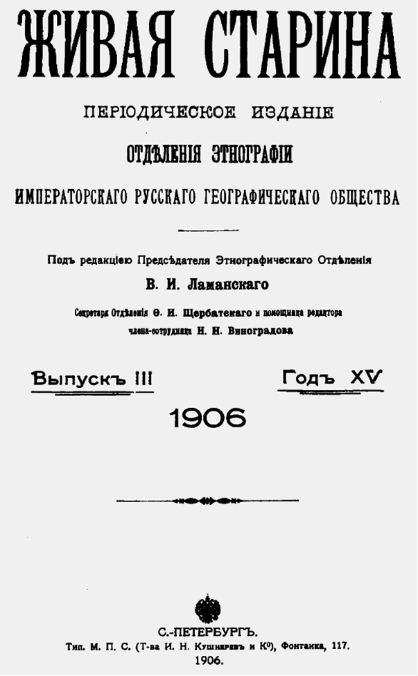 /Живая Старина. Періодическое изданіе Отдѣленія Этнографіи Императорскаго Русскаго Географическаго Общества. Вып. III. Отд. V. С.-Петербургъ. 1906. С. 58./