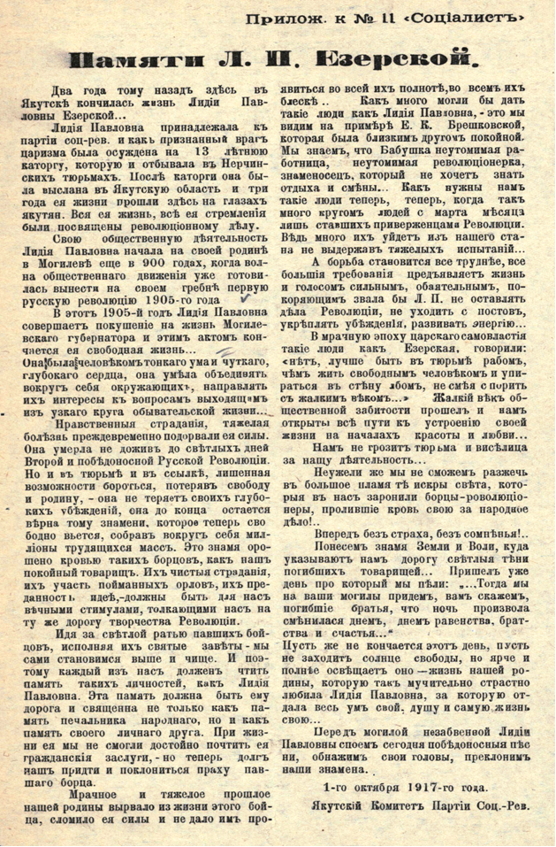 Не стало Лидии Павловны Езерской... Кто из якутян не знал или, по крайней мере, не слышал про эту еще не старую, живую, энергичную и такую очаровательную в личных отношениях женщину? Три года Л. П. прожила в Якутске, и за это время успела приобрести широкую популярность в городе: ее тонкий, проницательный ум, широта взглядов, чуткость и отзывчивость невольно влекли к ней всякого, кто ни соприкасался с ней. Но, конечно, она поближе всего была к ссылке, к которой она принадлежала не только по положению, но и по своим симпатиям, настроениям и по своей прошлой судьбе. Тяжелую жизнь прожила покойная, жизнь, полную физических и моральных страданий, но вместе из тем и жизнь высокого порыва, и твердого, неуклонно последовательного убеждения. Всю свою сознательную жизнь она отдала на служение общественному делу, перенеся ради этого служения все невзгоды и страдания.